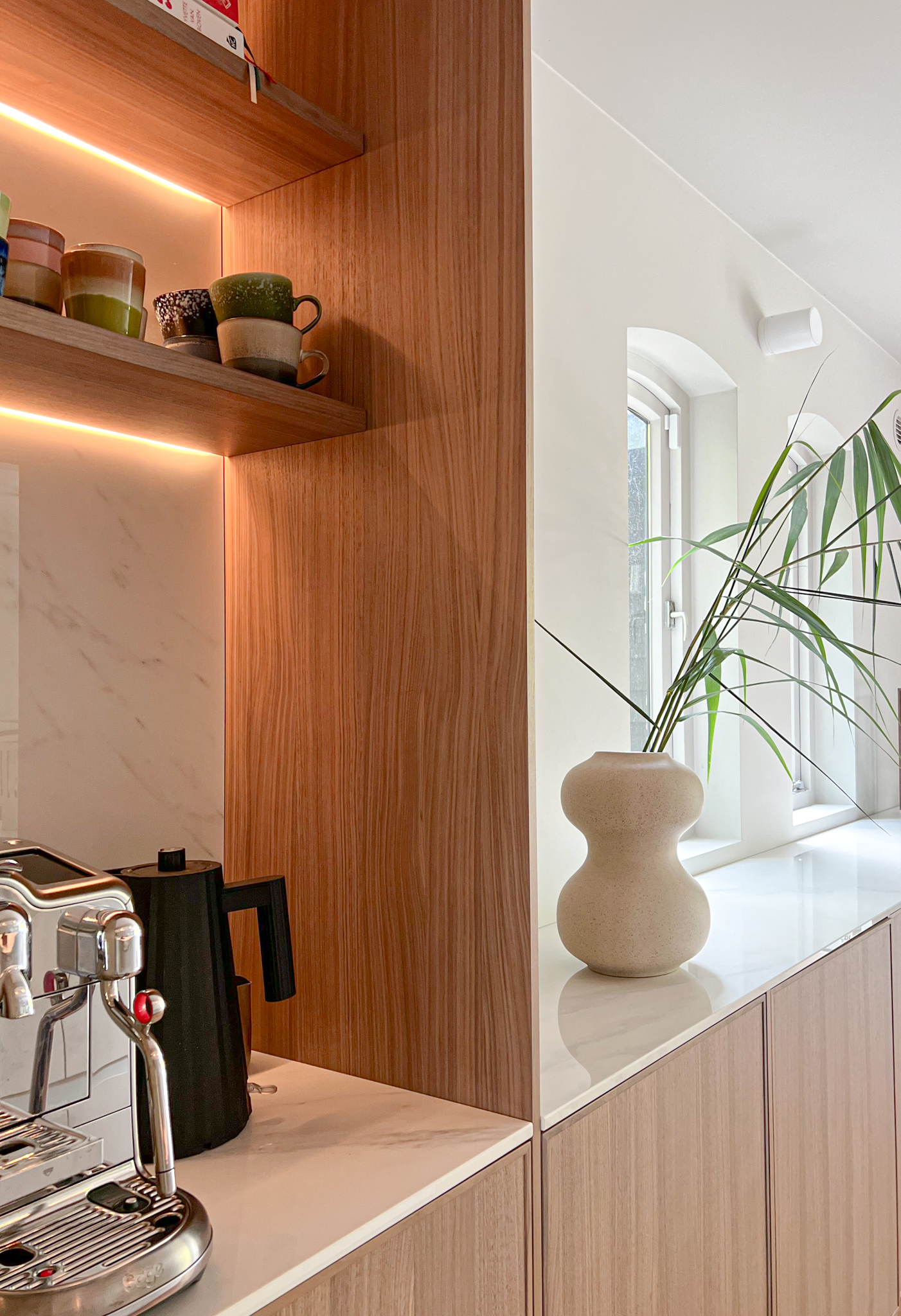Stap binnen in Casa Molino, een transformatieproject in Nederland dat een strakke hotel lobby sfeer combineert met subtiele Mediterrane vibes. Deze herinrichting van de benedenverdieping, inclusief de keuken en woonkamer, heeft een elegant en functioneel interieur gecreëerd dat uitnodigt tot ontspanning en samenzijn.